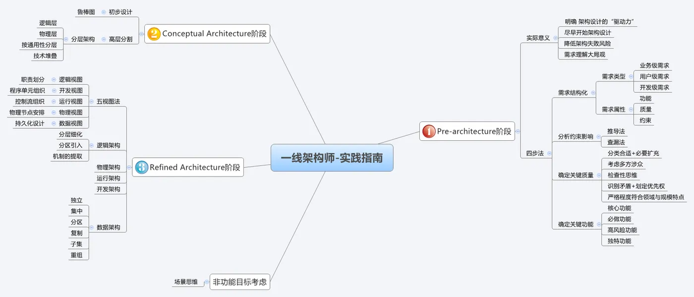 以前读过温同学的《软件架构设计》,对温同学还是比较信任的,所以义无反顾的买了这本书,花了一个星期的时间匆匆读完,感觉还不错吧。书中讲到的需求结构化,鲁棒图,五视图法和数据架构部分讲得不错,比较有感触。这里附上我读书过程中画的一个思维导图。