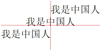 <svg width="100%" height="100%" version="1.1" xmlns="http://www.w3.org/2000/svg"> <text x="200" y="50" text-anchor="start" fill="black" style="font-size:40px;">我是中国人</text> <text x="200" y="100" text-anchor="middle" fill="black" style="font-size:40px;">我是中国人</text> <text x="200" y="150" text-anchor="end" fill="black" style="font-size:40px;">我是中国人</text> <path d="M200,0 V200 M0,100 H400" stroke="red"/> </svg>