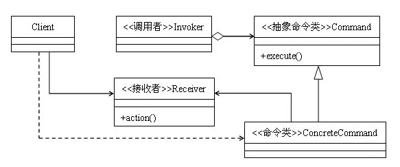 public interface Command { public void execute(); } public class ConcreteCommand implements Command { private Receiver receiver = null; private String state; public ConcreteCommand(Receiver receiver){ this.receiver = receiver; } public void execute() { receiver.action(); } } public class Receiver { public void action(){ //真正执行命令操作的功能代码 } } public class Invoker { private Command command = null; public void setCommand(Command command) { this.command = command; } public void runCommand() { command.execute(); } } public class Client { public void assemble(){ //创建接收者 Receiver receiver = new Receiver(); //创建命令对象,设定它的接收者 Command command = new ConcreteCommand(receiver); //创建Invoker,把命令对象设置进去 Invoker invoker = new Invoker(); invoker.setCommand(command); } }