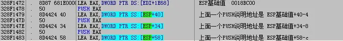 则汇编代码中的 ESP+OFFSET = ESP基础值+OFFSET-PUSH数*4。