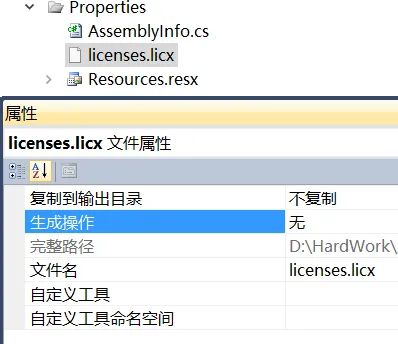 解决方法:在licenses.licx上右键,选择属性(Properties )修改生成操作(Build Action)为"无"即可。