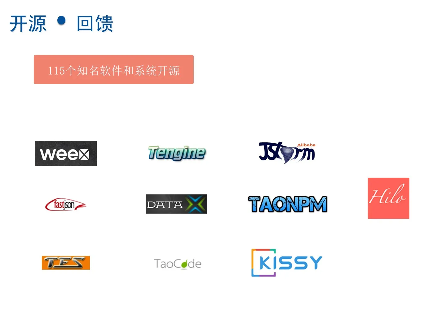 这个过程中阿里巴巴贡献了很多开源项目,大家可以看见的,像Tengine就是基于社区Nginx版本的发布版,相信很多大的互联网公司都在用它的发布版。其他的开源项目,比如Jstorm等阿里巴巴开源项目在业界应用也非常普遍。