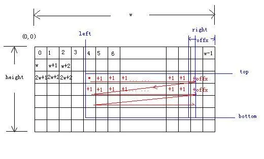 首先是扫描线问题,这个比较简单,按行扫描则符合像素的存储顺序。图中兰色代表扫描的区域,红色是扫描的顺序也就是地址的递增操作,需要注意的是每行扫描结束后需要增加offx,以跳到下一行行首地址,值应该为 w - right ,一般right都为选择区域内的最右边像素x坐标的再往右一个像素的坐标。