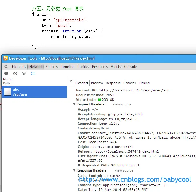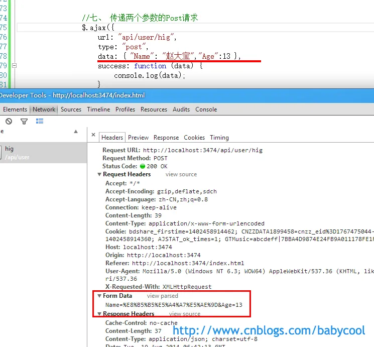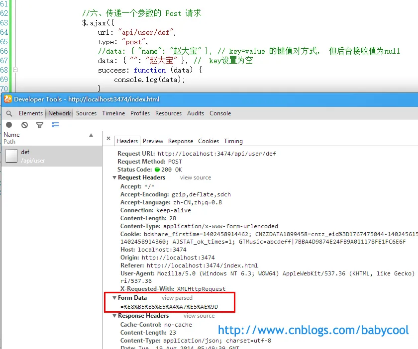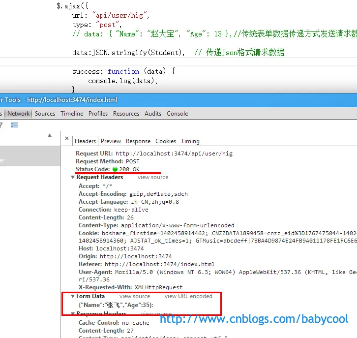 这里,我们通过上面图片中的请求头数据可以看到,Form Data 的格式是 key=value&key=value 这种表单数据格式 Name=%E8%B5%B5%E5%A4%A7%E5%AE%9D&Age=13 ,我们平时使用的比较多的一般为json格式。 这里,我们使用 JSON.stringify() 来序列化数据。