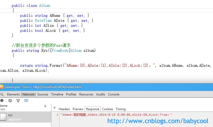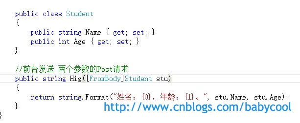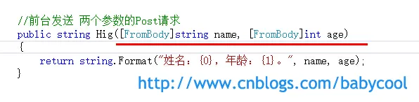 即在Action 方法中我们需要使用 [FromBody] 属性标签来标明属性。