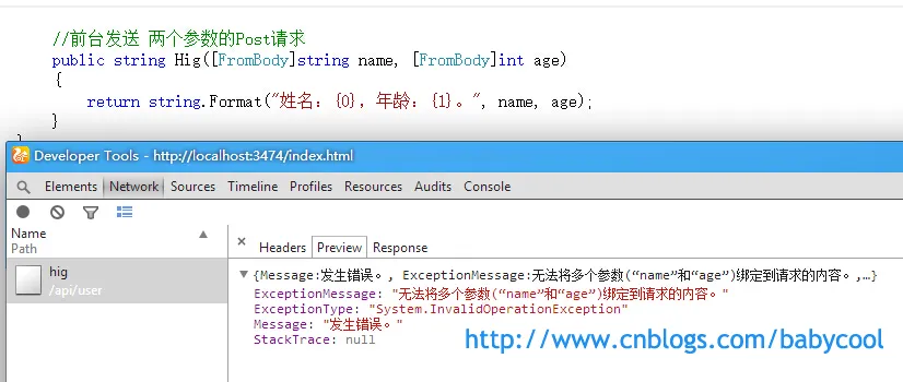 也就是说,[FromBody] 修饰的参数只能有一个。我们需要对传递的多个参数进行封装才行。