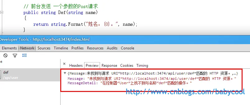 也就是说,Web API接收到的请求能够找到User控制器,但在该控制器中找不到名称为Def 的这个Action。