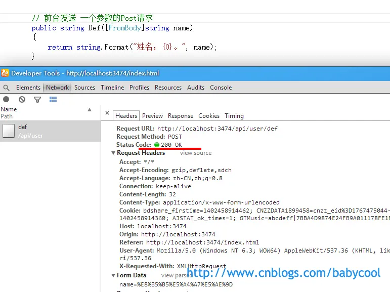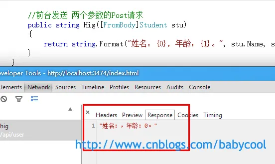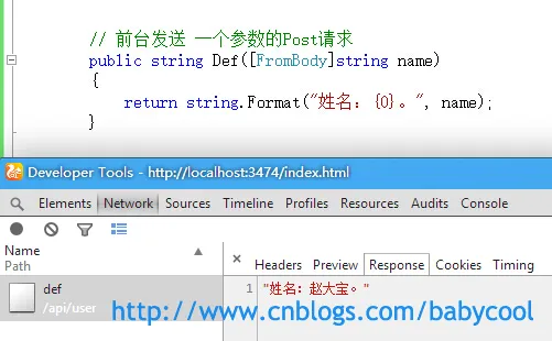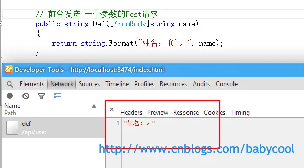 可以看到,在post请求中,方法的参数必须要用 [FromBody] 属性来修饰才可以, [FromBody] 就告诉Web API 要从post请求体重去获取参数的值。