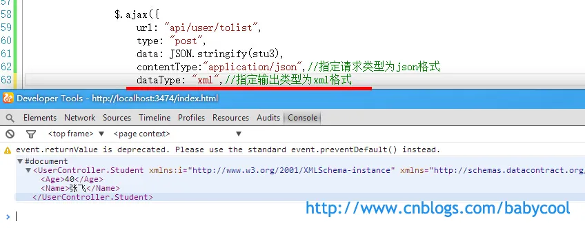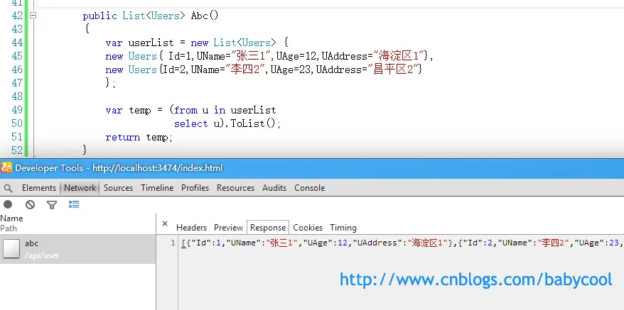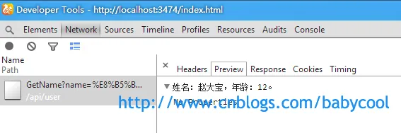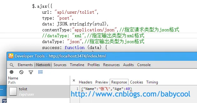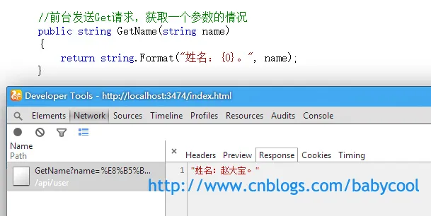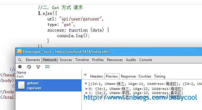 请求的后台Action方法仍为上篇文章中的GetUser() :