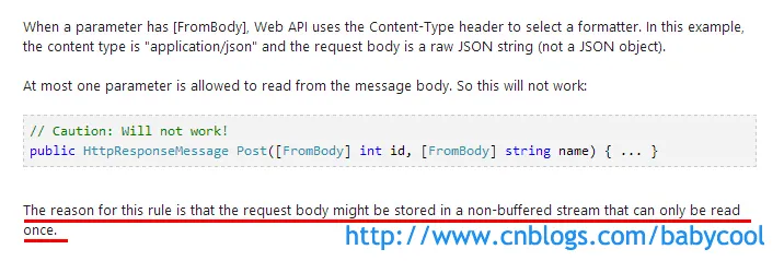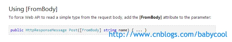 MSDN中关于Web API 中 [FromBody] 的介绍: Parameter Binding in ASP.NET Web API | The ASP.NET Site