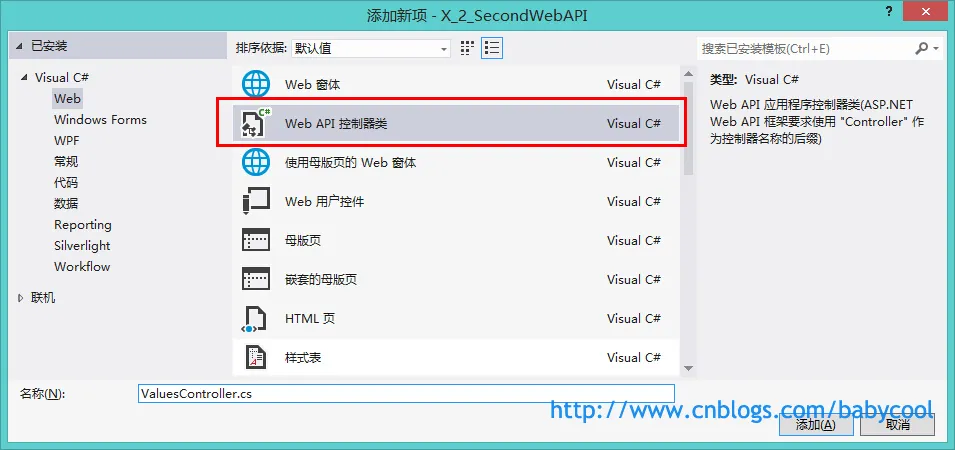 上面我们在测试的过程中,都是通过自己创建的Controller控制器类来对参数进行接收处理,可能有人会问,我们这么写到底是否符合规范呢,Web API中默认是怎么来处理的呢? 这里,Visual Studio 中也为我们自带了 Web API控制器类: