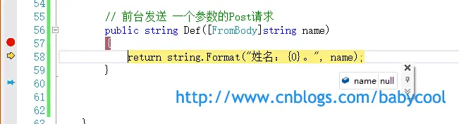 通过调试,我们可以看到,后台Action 中接收到的name值为null。