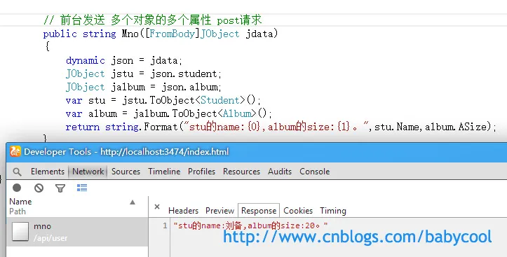 有时候我们还会遇到需要传递多个不同对象参数的情况,对于这种特殊的情况在 Json.Net 中为我们提供了一个 名为 JObject 的通用对象容器,我们可以通过 .对象名 的方式来动态的遍历参数里面的属性的值,然后动态的转换和json类型中对应的属性类型。