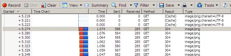 入正题,上面说到,该页面总共有8个弹出窗口,而且每个弹出窗口的都使用了不同的图片(不少是png),监控发现这些弹出窗口用的png图片虽然设置了缓存头(也使用了document.execCommand("BackgroundImageCache", false, true);),但是在IE6下每次都不直接使用缓存,而是发生1个请求,并得到304状态回应(原因我估计跟使用DD_belatedPNG来处理png图片有关,因为时间关系还没深入研究),监控图如下: