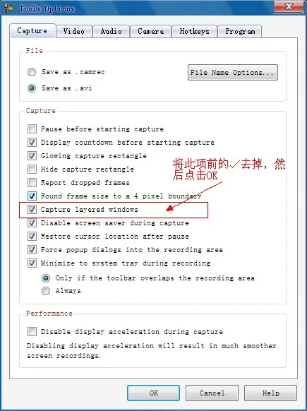 在“Capture”选项卡中,取消掉“Capture layered windows”这个选项前的勾,然后点“OK”:
