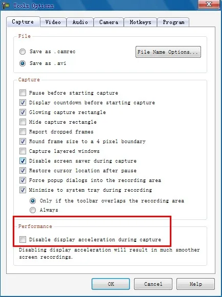 将“disable display acceleration during capture”这个选项打上勾,本人自己在测试时弹出
