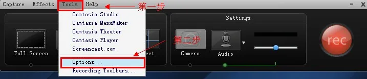 先启动录像机Camtasia Recorder录制屏幕,在菜单栏中选择“Tools”,再选择“Options…”: