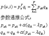其中,F表示隐类数量;p(u,k)表示用户u对第k个隐类的兴趣度;q(i,k)表示第k个隐类和物品i的相似度。Alpha表示学习速率;lamda表示正则化参数。