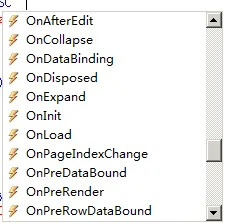 对于列表的事件,在Grid标签中,敲一下空格就会弹出可以使用的事件列表出来,只要绑定对应名称后,在cs文件中添加对应函数就能直接调用,具体大家可以去FineUI官网查看使用例子