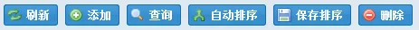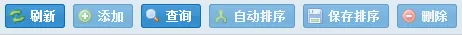 1 <f:Toolbar ID="toolBar" runat="server"> 2 <Items> 3 <f:Button ID="ButtonRefresh" runat="server" Text="刷新" Icon="ArrowRefresh" OnClick="ButtonRefresh_Click" CssClass="inline"></f:Button> 4 <f:Button ID="ButtonAdd" runat="server" Text="添加" Icon="Add" OnClick="ButtonAdd_Click"></f:Button> 5 <f:Button ID="ButtonSearch" runat="server" Text="查询" Icon="Magnifier" OnClick="ButtonSearch_Click"></f:Button> 6 <%--<f:Button ID="ButtonEdit" runat="server" Text="编辑" Icon="BulletEdit" OnClick="ButtonEdit_Click" 7 OnClientClick="if(!F('Panel1_Grid1').getSelectionModel().hasSelection()|| F('Panel1_Grid1').getSelectionModel().getCount()>=2){F.alert('您没有选择编辑项或只能选择一项进行编辑!'); return false; }"> 8 </f:Button>--%> 9 <f:Button ID="ButtonSaveAutoSort" runat="server" Text="自动排序" Icon="ArrowJoin" OnClick="ButtonSaveAutoSort_Click" ConfirmTitle="自动排序提示" ConfirmText="是否对所有数据进行自动排序?"></f:Button> 10 <f:Button ID="ButtonSaveSort" runat="server" Text="保存排序" Icon="Disk" OnClick="ButtonSaveSort_Click"></f:Button> 11 <f:Button ID="ButtonDelete" runat="server" Text="删除" Icon="Delete" OnClick="ButtonDelete_Click" ConfirmTitle="删除提示" ConfirmText="是否删除记录?" 12 OnClientClick="if (!F('Panel1_Grid1').getSelectionModel().hasSelection() ) { F.alert('删除时必须选择一条将要删除的记录!'); return false; } if (F('Panel1_Grid1').getSelectionModel().getCount() >= 2) { F.alert('只能选择一条记录进行删除!');return false; }"> 13 </f:Button> 14 </Items> 15 </f:Toolbar>