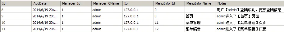 本次更新,除了修改一些小问题外,也修改了CommonBll.cs类的添加用户访问页面记录函数,以及自定义类UseLogBll.cs类的添加用户操作日志函数,让用户访问页面记录运行起来,当然这个表记录的不至这些访问内容,它还会将用户的增、删、查、改等所有操作都记录下来,下面看看效果图(这个函数会将用户登陆进系统后每一步访问都记录下来,这个要求是来自以前的公司老总,当时做了一个OA系统公司自己用,他看了后就说:OA开发后,如果大家都不登陆不使用那有等于没有,能不能实现通过后端查看,知道大家有没有使用。再然后就多了这个功能,呵呵)