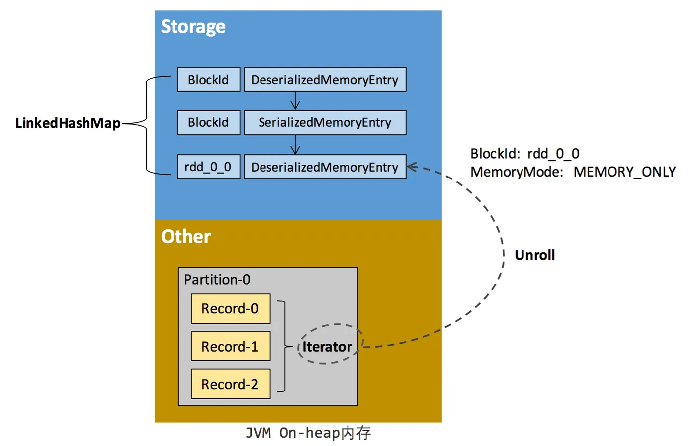 RDD 在缓存到存储内存之后,Partition 被转换成 Block,Record 在堆内或堆外存储内存中占用一块连续的空间。将Partition由不连续的存储空间转换为连续存储空间的过程,Spark称之为"展开"(Unroll)。Block 有序列化和非序列化两种存储格式,具体以哪种方式取决于该 RDD 的存储级别。非序列化的 Block 以一种 DeserializedMemoryEntry 的数据结构定义,用一个数组存储所有的对象实例,序列化的 Block 则以 SerializedMemoryEntry的数据结构定义,用字节缓冲区(ByteBuffer)来存储二进制数据。每个 Executor 的 Storage 模块用一个链式 Map 结构(LinkedHashMap)来管理堆内和堆外存储内存中所有的 Block 对象的实例[6],对这个 LinkedHashMap 新增和删除间接记录了内存的申请和释放。