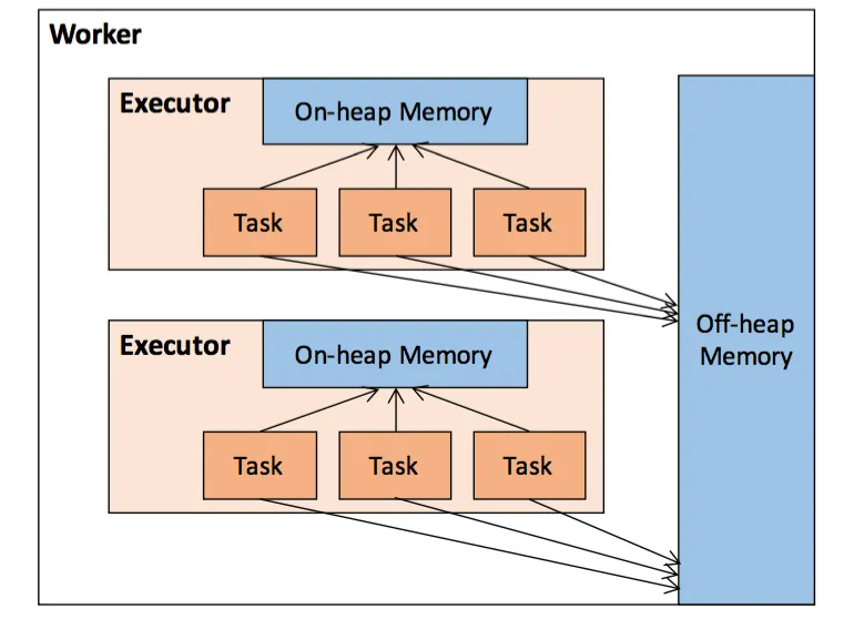 作为一个 JVM 进程,Executor 的内存管理建立在 JVM 的内存管理之上,Spark 对 JVM 的堆内(On-heap)空间进行了更为详细的分配,以充分利用内存。同时,Spark 引入了堆外(Off-heap)内存,使之可以直接在工作节点的系统内存中开辟空间,进一步优化了内存的使用。