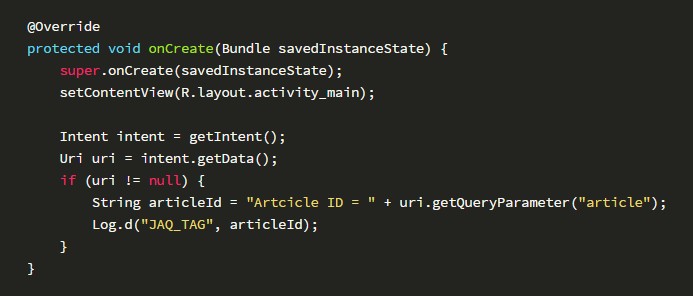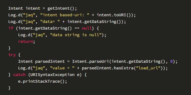 常见的用法是在APP获取到来自网页的数据后,重新生成一个intent,然后发送给别的组件使用这些数据。比如使用Webview相关的Activity来加载一个来自网页的url,如果此url来自url scheme中的参数,如:jaq://jaq.alibaba.com?load_url=http://www.taobao.com。