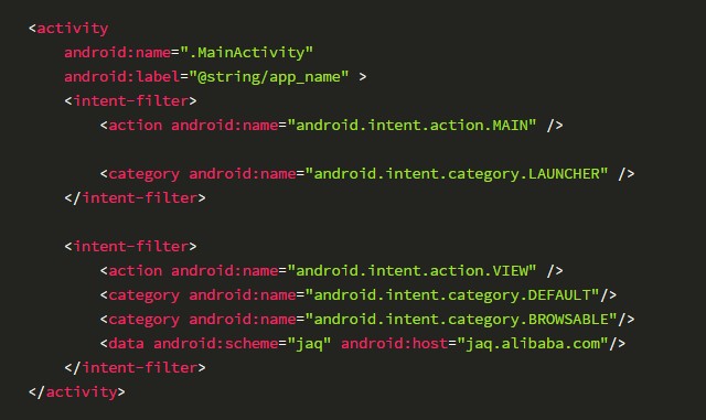 APP端接收来自网页信息的Activity,要在Androidmanifest.xml文件中Activity的intent-filter中声明相应action、category和data的scheme等。