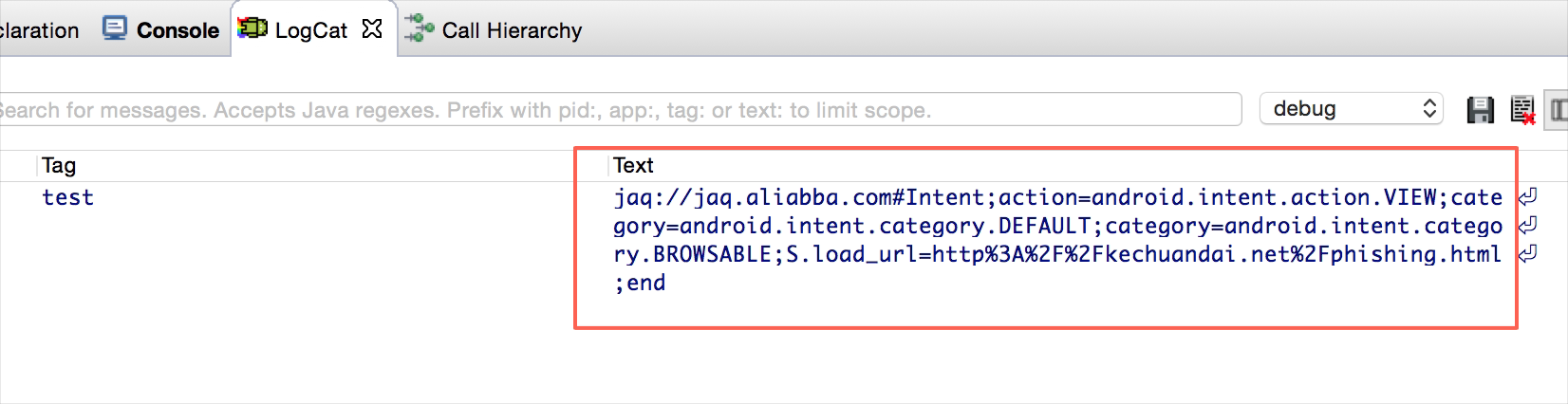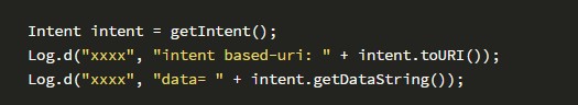 APP端中的Androidmanifest.xml的声明写法同2.1节中的APP端写法完全一样。对于接收到的uri形式的intent,一般使用Intent的parseUri()方法来解析产生新的intent对象,如果处理不当会产生Intent Scheme URL攻击。