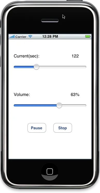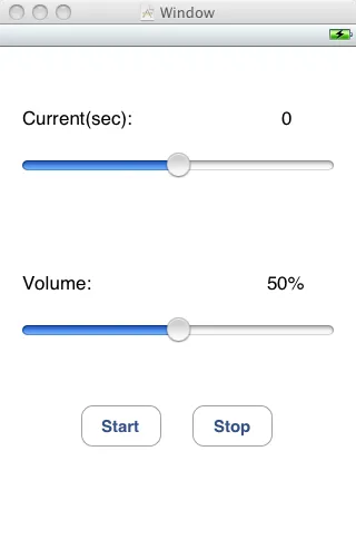 其中,最上面是两个Label,左边的Current(sec)始终不变,右边的0显示当前已播放的时间,下面是一个Slider,类似与一般播放器的进度条,再下面是音量调节的Slider,它们的min都是0.0,max都是1.0。最底下是两个Button。
