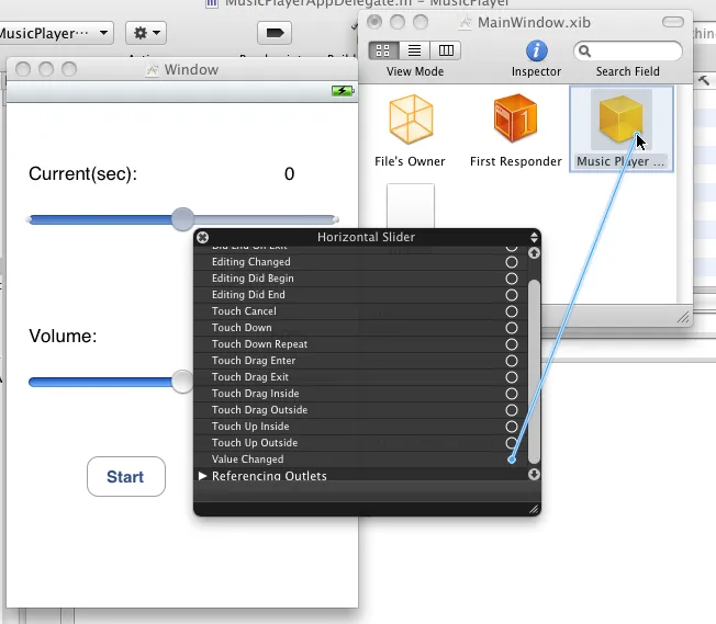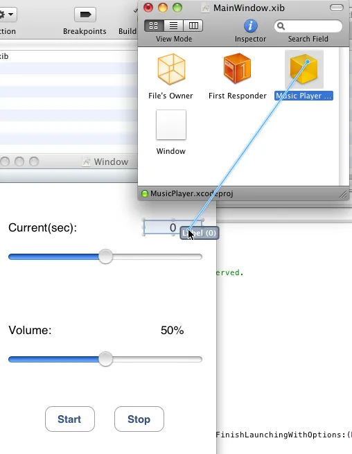 打开MainWindow.xib,按住Ctrl键,鼠标从Music Player Delegate上拖动到相应的Label上,将它和IBOutlet相连接: