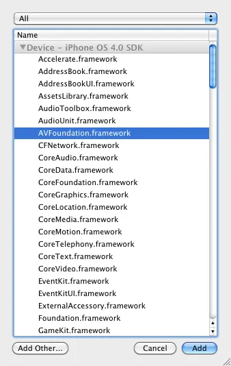 由于播放声音需要用到AVFoundation.framework,因此我们将它加入到我们的工程中:
