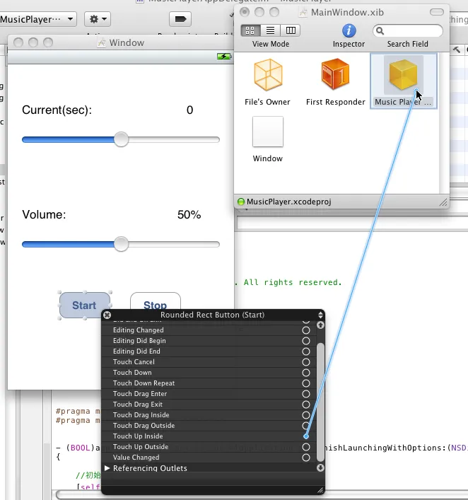 右键Button,选择Touch Up Inside,将后面的小圆圈拖动到Music Player Delegate上,连接相应的IBAction: