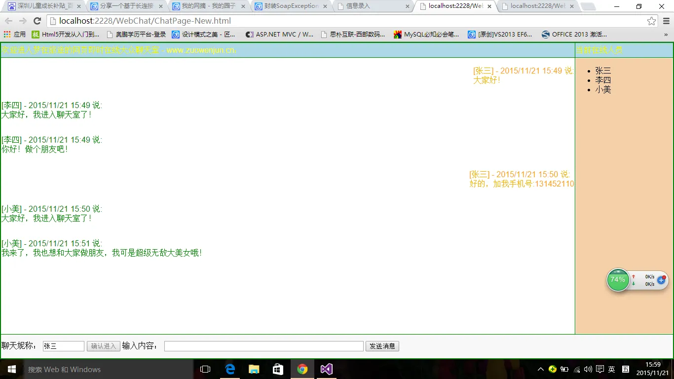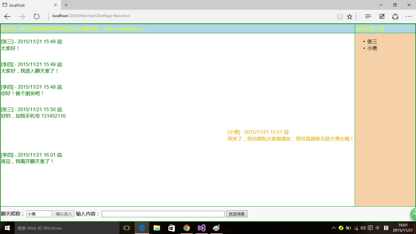 实现网页版的在线聊天室的方法有很多,在没有来到HTML5之前,常见的有:定时轮询、长连接+长轮询、基于第三方插件(如FLASH的Socket),而如果是HTML5,则比较简单,可以直接使用WebSocket,当然HTML5目前在PC端并没有被所有浏览器支持,所以我的这个聊天室仍是基于长连接+长轮询+原生的JS及AJAX实现的多人在线即时交流聊天室,这个聊天室其实是我上周周末完成的,功能简单,可能有些不足,但可以满足在线即时聊天需求,分享也是给大家提供一个思路,大家可以基于此来实现更好的在线即时聊天工具。