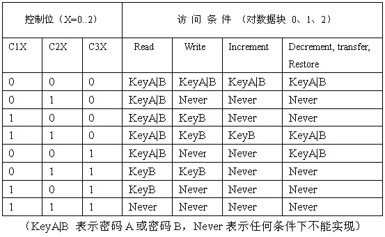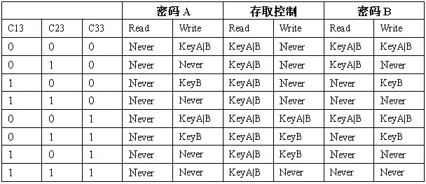例如:当块0的存取控制位C10 C20 C30=100时,验证密码A或密码B正确后可读;验证密码B正确后可写;不能进行加值、减值操作。