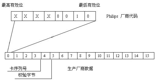 第一个扇区的第一块由厂商使用,存储了IC卡的生产产商代码,这个块中的数据写入后不能被修改。如下图所示: