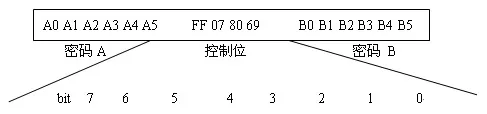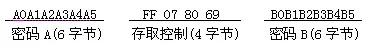 每个扇区都有个扇区尾部。包括密码A(不能读出)、密码B及相应扇区中的所有块的存储控制位(位于第6个字节到第9个字节),存储结构如下: