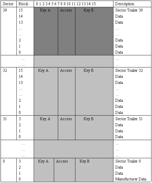 卡片有4K的存储空间,有32个小扇区和8个大扇区。小扇区的结构为:每扇区有4块,每块16个字节,一共64字节,第3块为密钥和控制字节;大扇区的结构为:每扇区16块,每块16个字节,一共256字节,第15块为密钥和控制字节;详细介绍如下: