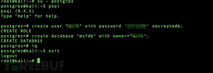 # su postgrespostgres@kali:/root$ psql postgres=# create user "msf3" with password 's1riu5' nocreatedb; postgres=# create database "msfdb" with owner="msf3";