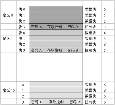 1、M1卡分为16个扇区,每个扇区由4块(块0、块1、块2、块3)组成,(我们也将16个扇区的64个块按绝对地址编号为0~63,存贮结构如下图所示: