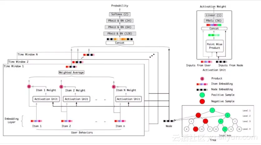 图(1)形象的描述了TDM(带Attention版本)训练时的模型结构,其中树是一棵完全二叉树(但TDM框架本身并不要求树必须是二叉结构)。