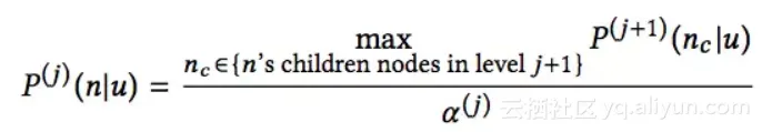 即用户对第j层父亲节点兴趣的偏好概率正比于用户对第j+1层孩子节点兴趣的偏好概率最大值,其中