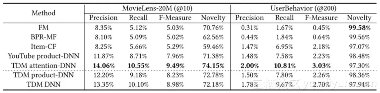 我们在公开数据集MovieLens和阿里妈妈构建的广告数据集UserBehavior上进行了TDM的实验对比,评价指标包括精度、召回率、精度召回率调和F1和新颖性等方面,对比的方法包括:
