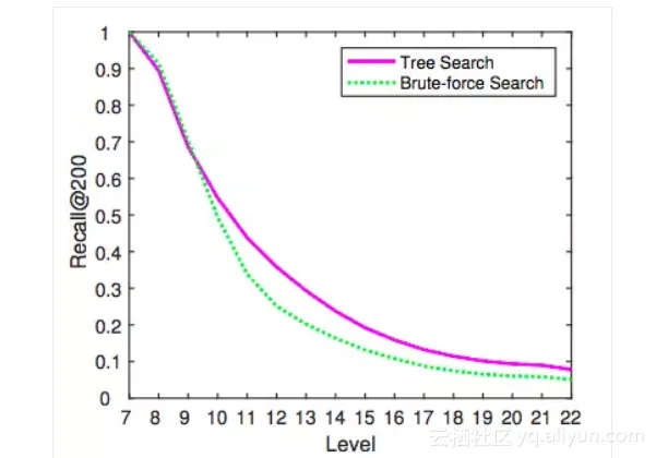 图4 树检索和暴力检索在每一层上的召回率对比