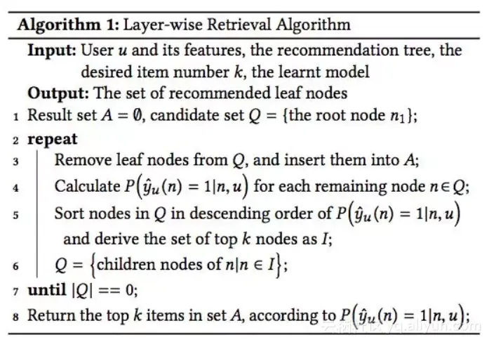 遵循TDM层次检索的原理,我们只需要从根节点出发,自顶向下依次逐层选取该层候选孩子中最优的K个节点即可。也即我们有层次检索算法:对于最终要求K个叶子目标推荐的情况下,选择当前层概率最高的K个节点,然后往下层扩展他们的孩子节点,对下层孩子节点进行概率估计,选取概率最高的K个,递归计算和选取直至所有路径都到达叶子层,最后从候选叶子集合(可能大于2K个)中取概率最高的K个返回即可。具体的检索逻辑可参考图2的伪代码描述。在TDM的实验中,层次TopK的检索被实验证明是有效的,甚至是优于平层暴力(Brute-force)检索的,这一点也侧面验证了兴趣树的层次结构可以有效促进检索的精度提升,具体的提升效果可参见后文实验效果部分。
