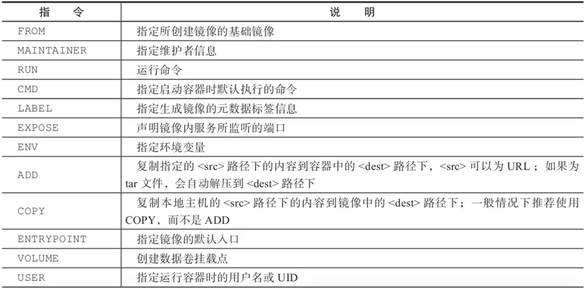 指令的一般格式为INSTRUCTION arguments,指令包括FROM、MAINTAINER、RUN等,参见表8-1。