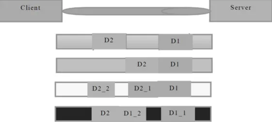 假设客户端分别发送了两个数据包D1和D2给服务端,由于服务端一次读取到的字节数是不确定的,故可能存在以下4种情况。