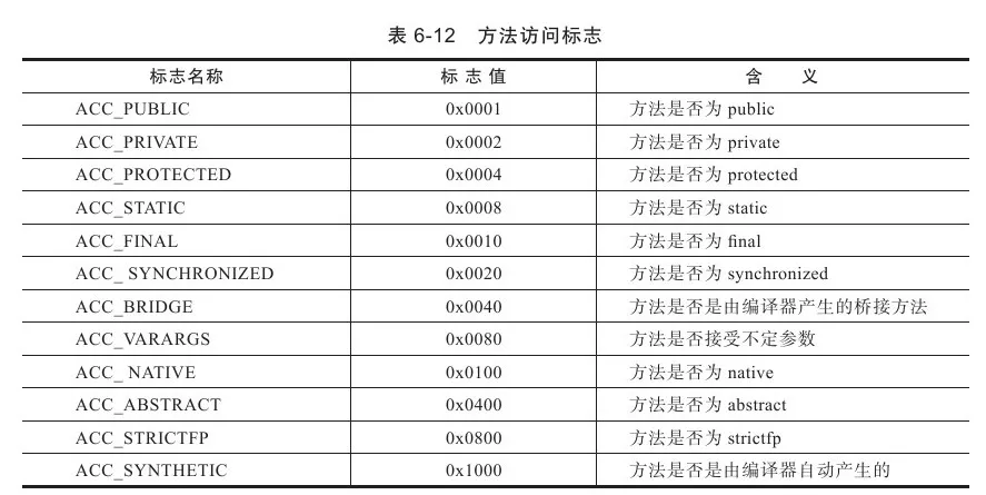 因为volatile关键字和transient关键字不能修饰方法,所以方法表的访问标志中没有了ACC_VOLATILE标志和ACC_TRANSIENT标志。与之相对的,synchronized、native、strictfp和abstract关键字可以修饰方法,所以方法表的访问标志中增加了ACC_SYNCHRONIZED、ACC_NATIVE、ACC_STRICTFP和ACC_ABSTRACT标志。对于方法表,所有标志位及其取值可参见表6-12。