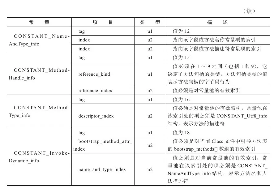 bootstrap_arguments[]:bootstrap_arguments[]数组的每个成员必须是一个对常量池的有效索引。常量池在该索引处必须是下列结构之一:CONSTANT_String_info、CONSTANT_Class_info、CONSTANT_Integer_info、CONSTANT_Long_info、CONSTANT_Float_info、CONSTANT_Double_info、CONSTANT_MethodHandle_info或CONSTANT_MethodType_info。